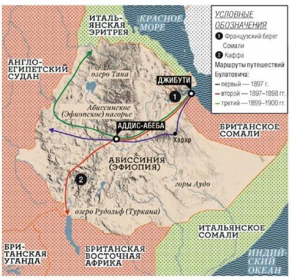 Эфиопия настолько очаровала корнета, что он решил поближе познакомиться со страной и остался здесь после завершения российской миссии в начале 1897 года. С разрешения негуса Булатович отправился в путешествие по Абиссинии. Свои наблюдения он изложил в книге «От Энтото до реки Баро». В ней корнет много рассуждал о политике: Эфиопия — главный соперник Англии в Центральной Африке, и Россия должна всеми способами помогать ей, чтобы помешать британцам завладеть сердцем Черного континента.