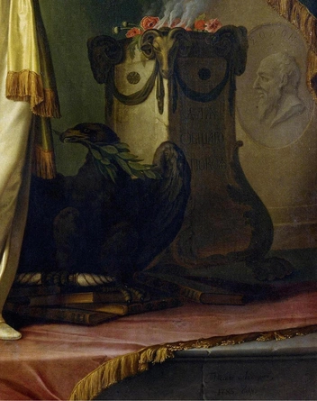 Античные символы сочетаются на картине с реальными наградами Российской империи. Например, регалиями ордена Святого Владимира, которым награждали за служение обществу.