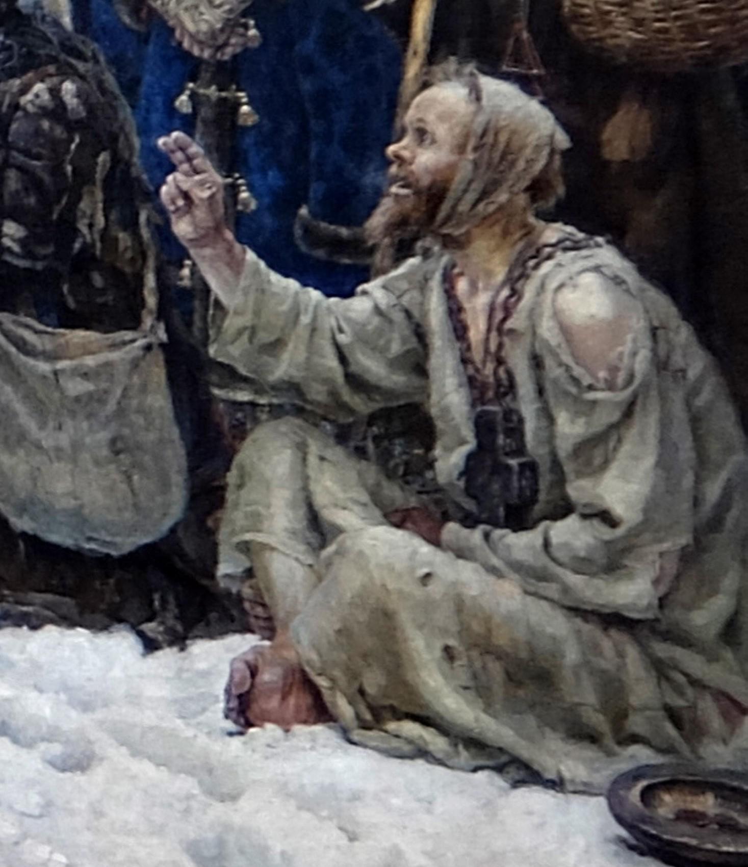 16. Юродивый в веригах. Сочувствуя Морозовой, он крестит ее таким же раскольничьим двоеперстием и не боится наказания: юродивых на Руси не трогали. Подходящего натурщика художник нашел на рынке. Мужичок, торговавший огурцами, согласился позировать на снегу в одной холщовой рубахе, и живописец растирал его озябшие ноги водкой. «Я ему три рубля дал, — рассказывал Суриков. — Это для него большие деньги были. А он первым долгом лихача за рубль семьдесят пять копеек нанял. Вот какой человек был».