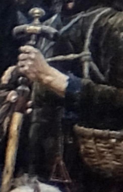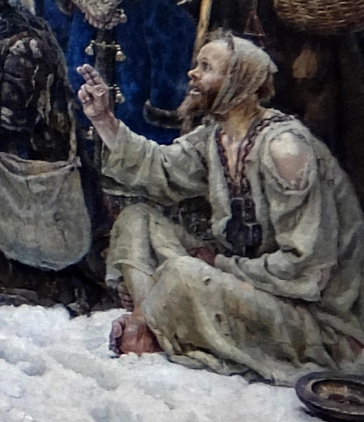 14. Странник. Подобные типажи скитальцев-богомольцев с посохами и котомками встречались и в конце XIX века. Этот странник — идейный союзник Морозовой: он снял шапку, провожая осужденную; у него такие же, как у нее, старообрядческие четки. Среди этюдов к этому образу есть автопортреты: когда художник решил изменить поворот головы персонажа, паломника, который ему позировал изначально, было уже не найти.