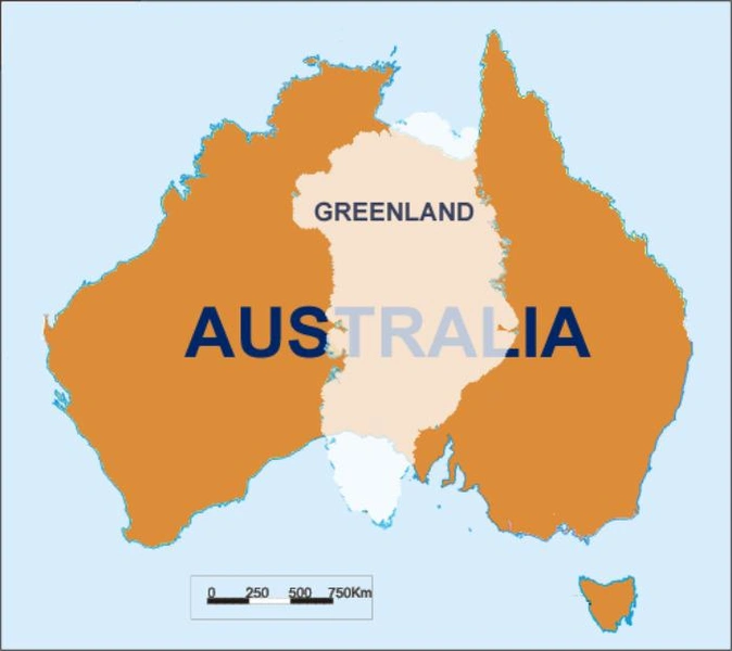 На привычных нам картах Гренландия сопоставима по размерам с Австралией, однако последняя является материком, а Гренландия довольствуется званием самого большого в мире острова. Все дело в используемой картографами проекции Меркатора, из-за которой участки суши, расположенные поблизости от полюсов выглядят намного больше, чем на самом деле. Реальная площадь Гренландии составляет около 2,17 млн км2, примерно втрое меньше площади Австралии — самого маленького из материков.