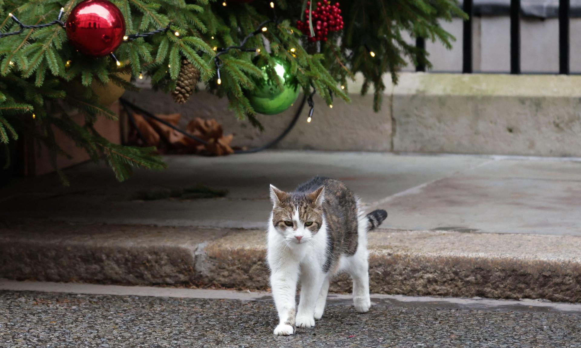 Великобритания, Лондон. На фото, сделанном 10 декабря, кот-мышелов Ларри инспектирует рождественскую ель перед входом в лондонскую резиденцию премьер-министра Великобритании на Даунинг-стрит.