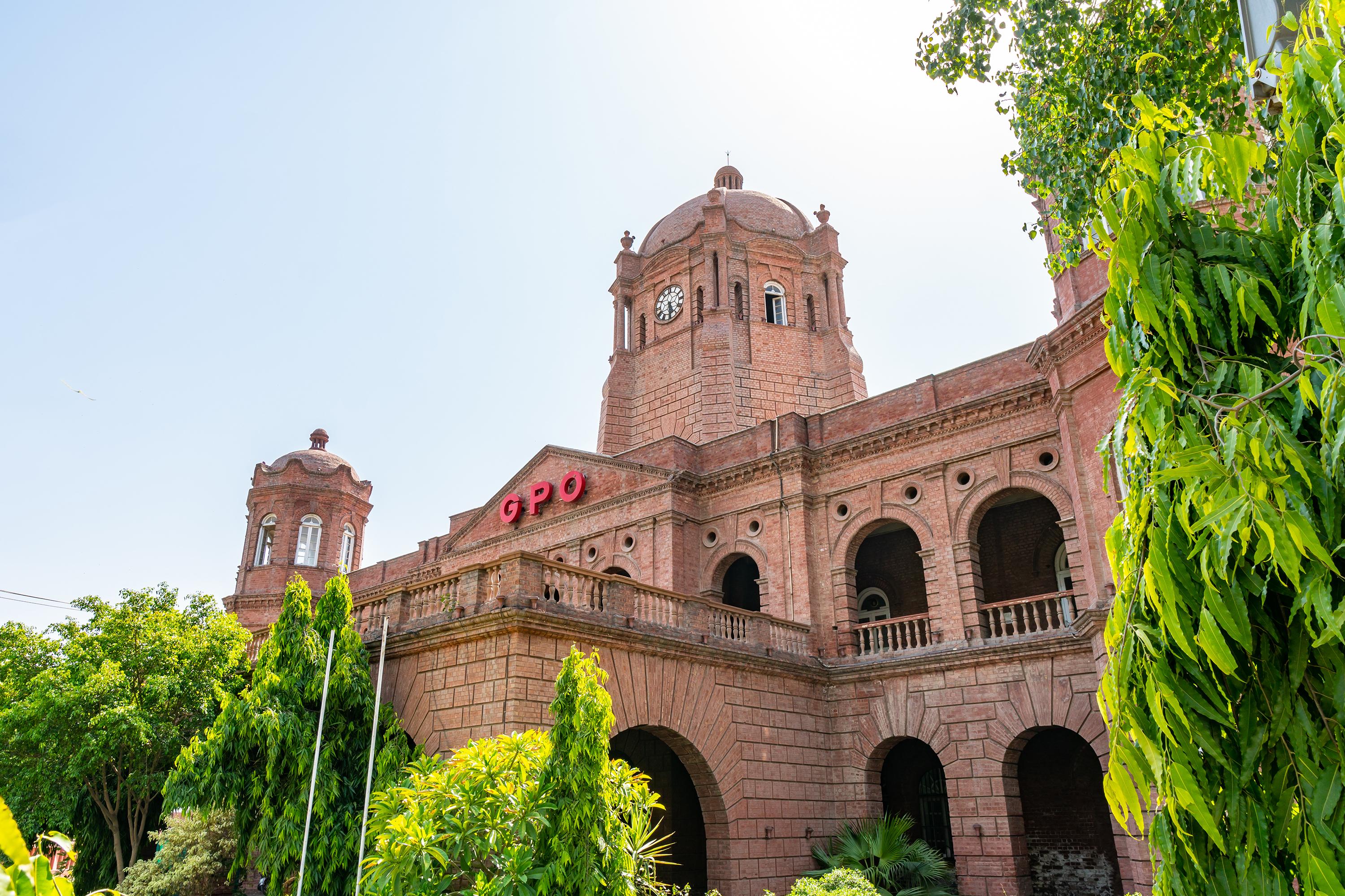 Здание центрального почтамта Лахора было построено в 1887 году в честь 50-летия королевы Виктории. Его архитектором стал сэр Ганга Рам, «отец современного Лахора», сочетавший колониальный стиль с элементами местной культуры. Здание почты состоит из двух главных залов и двух минаретов.