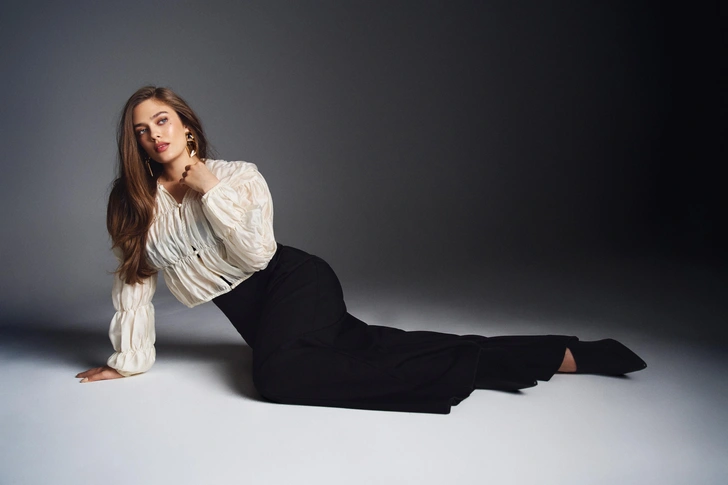 В центре внимания — дуэт из блузы «Жемчуг» и брюк «Обсидиан» — наглядный пример того, как в одном образе могут сочетаться нежность и графичность. Блуза из экологичного тенселя подойдет любительницам свободных силуэтов, а спущенное плечо, полупрозрачная фактура и вырез-«лодочка» создадут романтичный настрой. Брюки из костюмной ткани в трендовом силуэте палаццо с высокой посадкой, объемными складками спереди и длиной в пол послужат элегантным фундаментом образа и гармонично уравновесят воздушный верх.