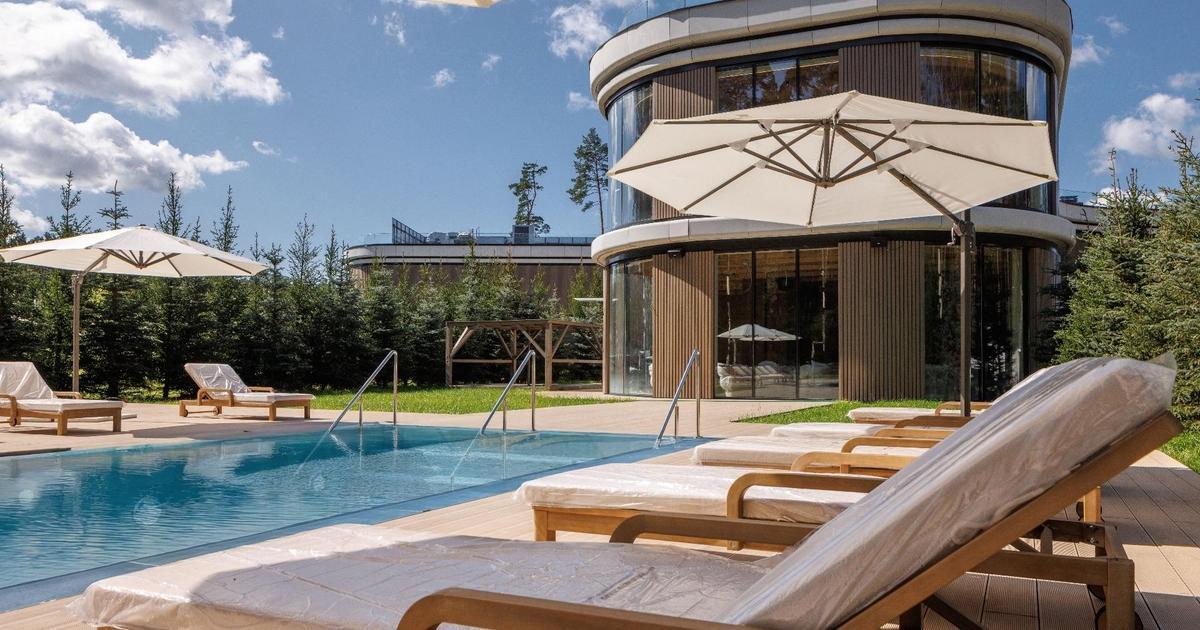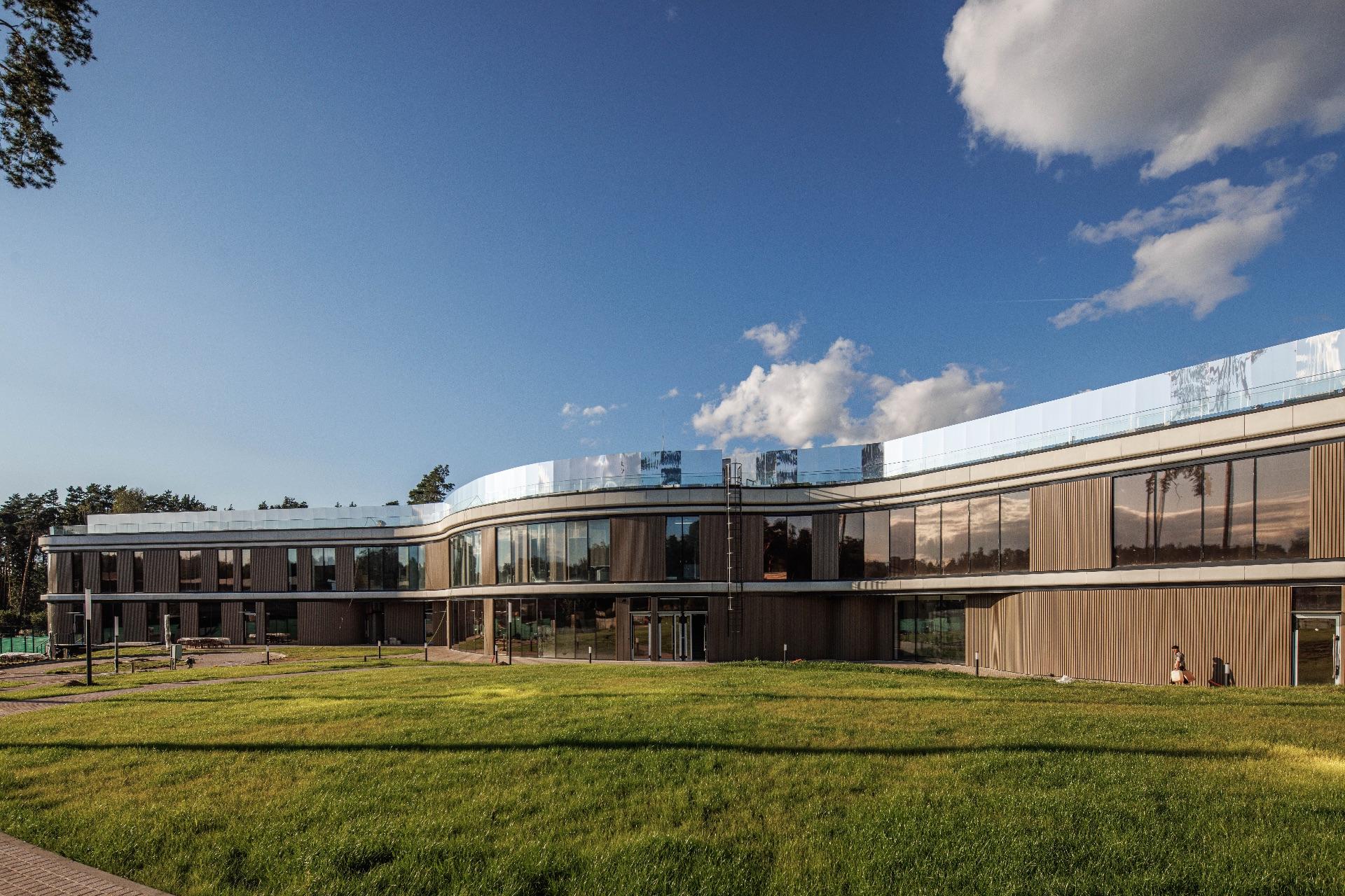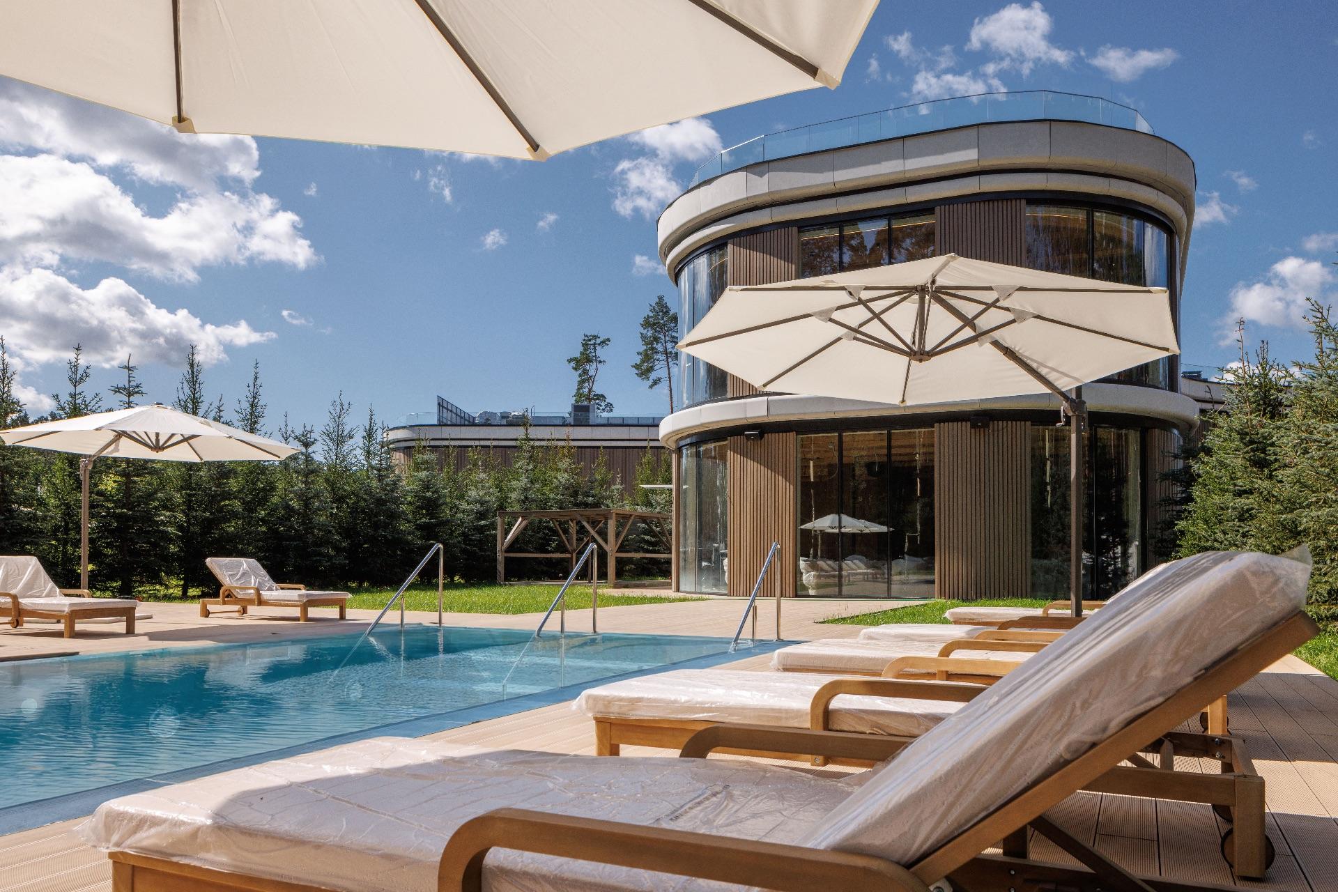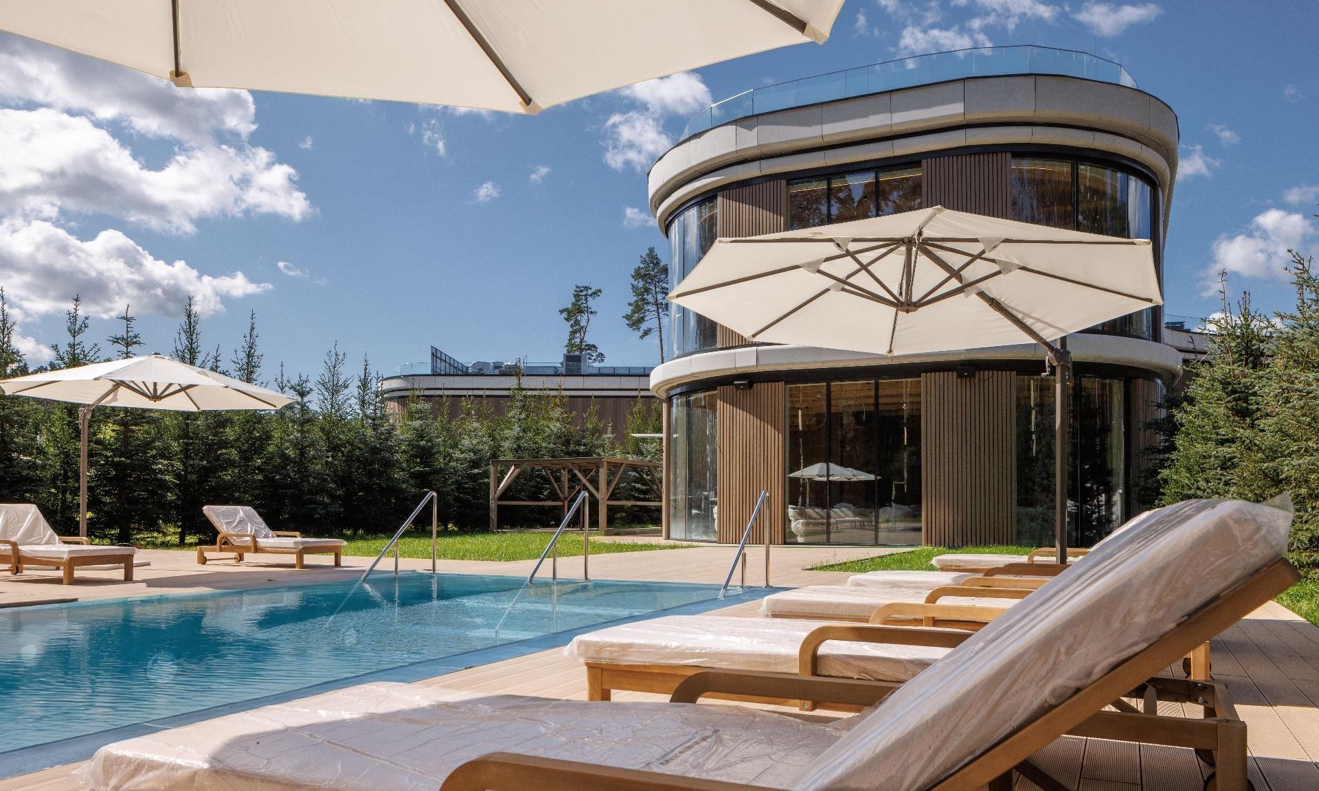 Архитекторы смогли вписать комплекс в пространство искусства: среди арт-объектов Игоря Шелковского и Франциско Инфанте и под шум каскадного водопада. Так появилось место покоя и света, созданное из гранита, дерева и стекла с панорамным видом на сосновый лес. В интерьере преобладают натуральные материалы: дубовый ресепшн, песочные оттенки и натуральная зелень. Снаружи — аромат смолы и хвои, а внутри — четыре разряда: женский, мужской, в которых есть отдельные кабинеты для уединения компаний, общественный и три VIP. В женском построили самую большую в России парную из липы с 12-тонной печью и хаммамом со звёздным небом. Для женщин предусмотрели четырехчасовое парение, чтобы ничто их не отвлекало от времени наедине с собой. В мужском — две парные на 130 гостей, собственный двор с двумя большими купелями контрастных температур и террасой, где можно отдохнуть на сеновале. Для компаний и семей предусмотрен общественный разряд, где они могут встретиться в панорамной травяной парной. Крупноформатные окна — фишка в ансамбле здания, крайне нетипичная для классических банных построек.