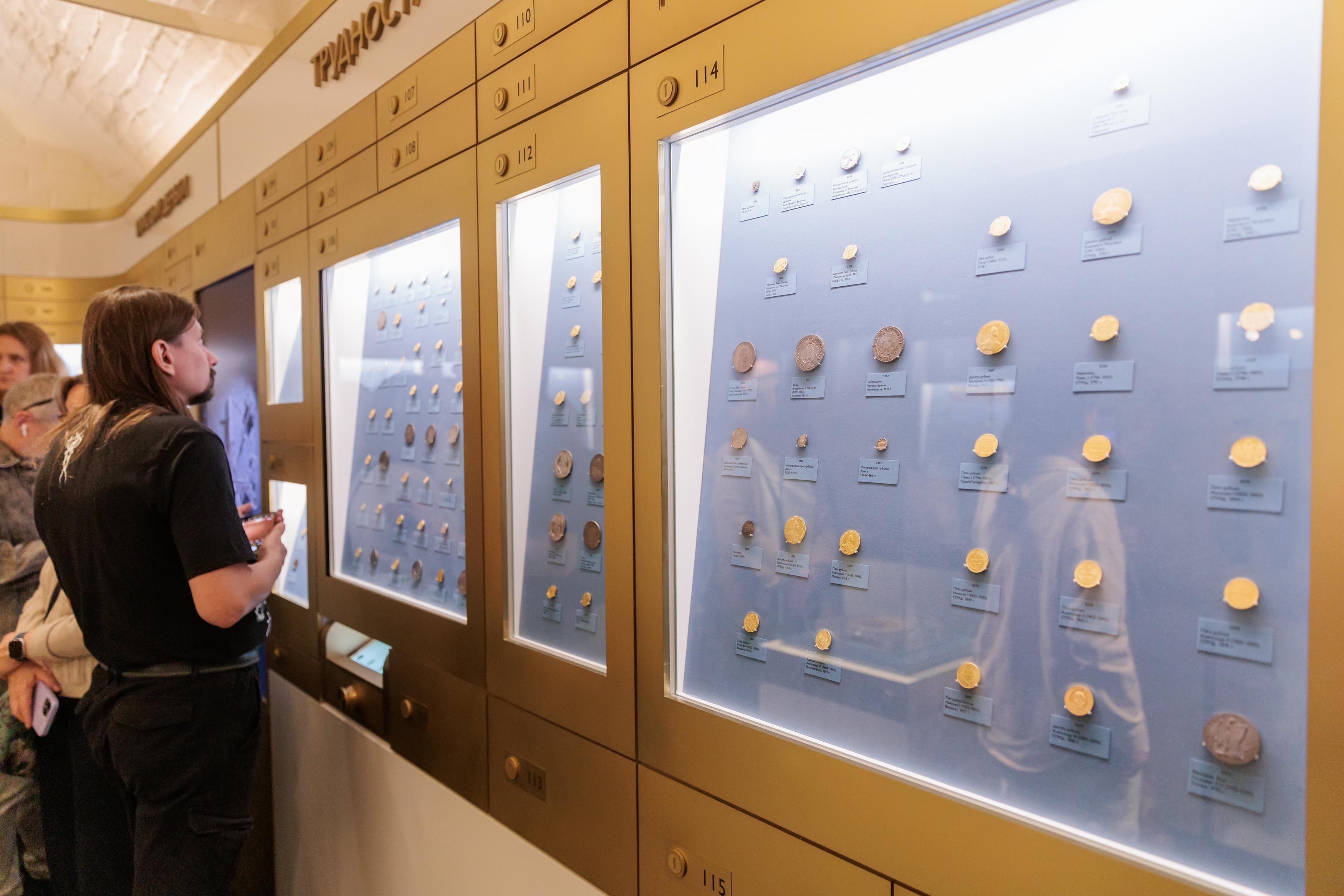 Концепция оформления выставки построена вокруг идеи сейфового хранилища — пространства, где ценности скрыты от посторонних глаз и защищены кодами. Метафора экспозиционного дизайна подчеркивает загадочность и многослойность нумизматики. Посетители оказываются словно внутри банковского сейфа и погружаются в атмосферу поиска и тайны.