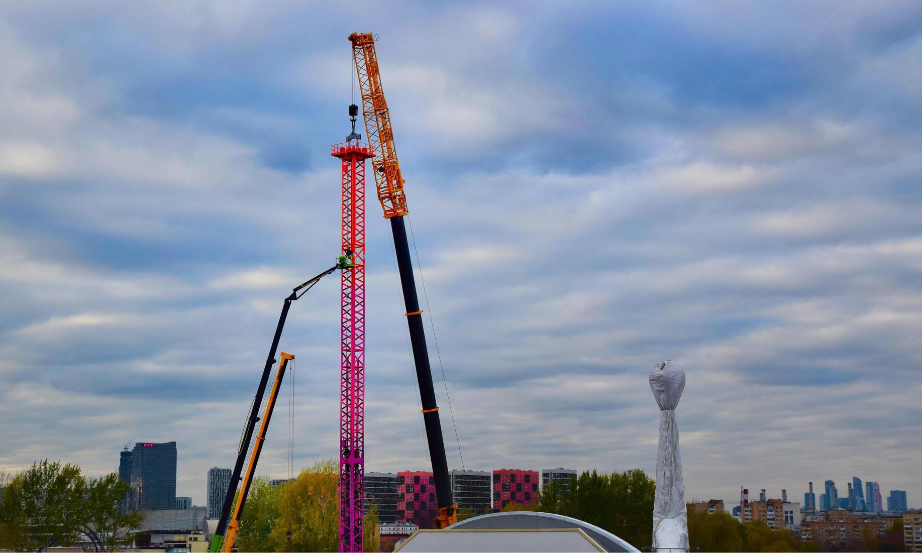 «Башня состоит из пяти секций. На земле элементы собираются попарно, после чего при помощи двух мощных кранов конструкции аккуратно поднимаются и переводятся в вертикальное положение — один кран удерживает нижнюю часть, второй —обеспечивает плавный подъем, и далее секции стыкуются друг с другом», — объясняет технический директор «Острова мечты» Глеб Пауль.