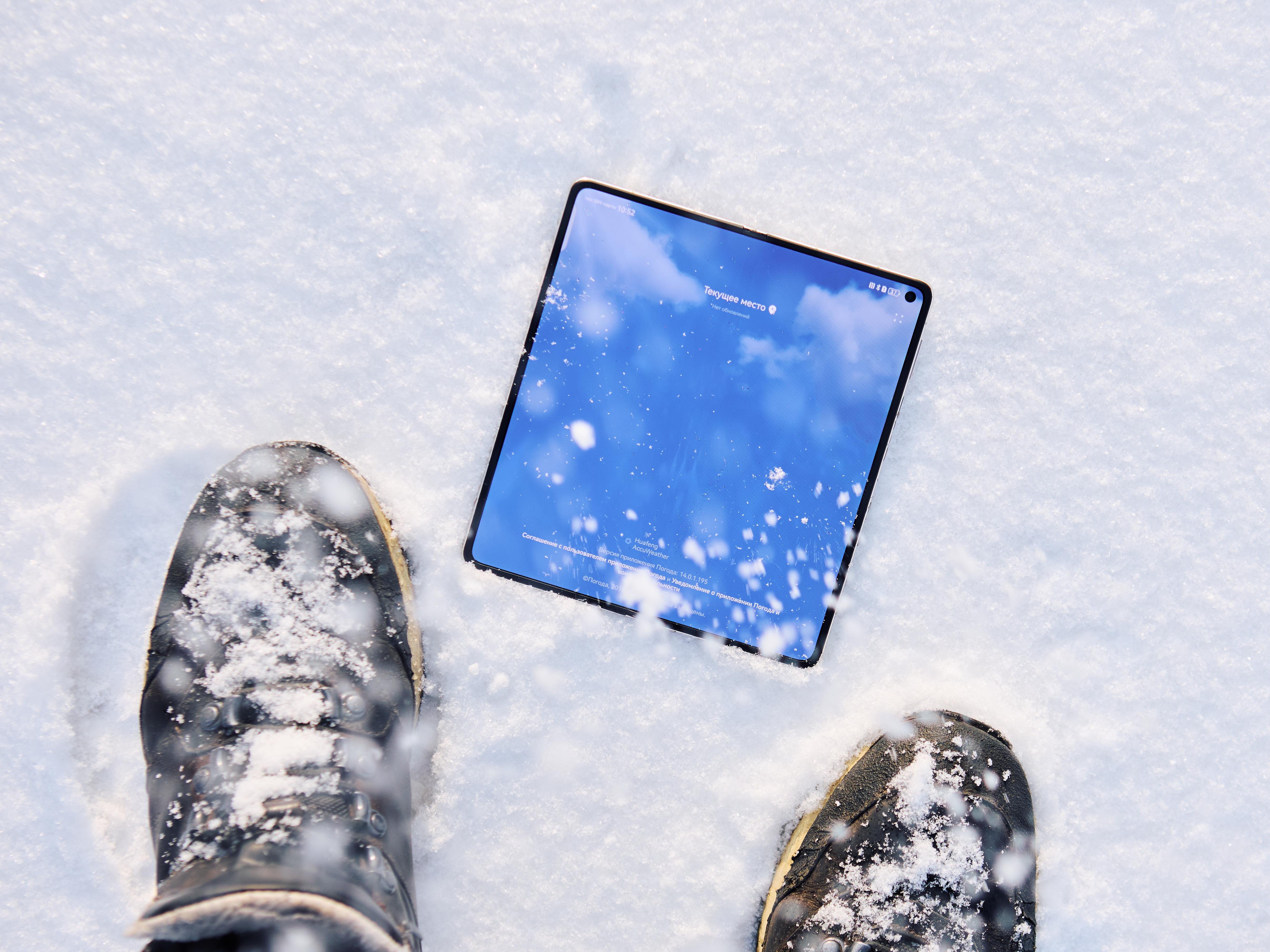 Весь январь любая съемка на московских улицах была настоящим испытанием для смартфона. Снег сыпал не переставая. Поначалу я слегка переживал, что мой испытуемый не выдержит. Но у Mate X7 защита по классу IP58/IP59. Это значит, что он не только не боится падения в лужу, но и выдерживает струи горячей воды под давлением.