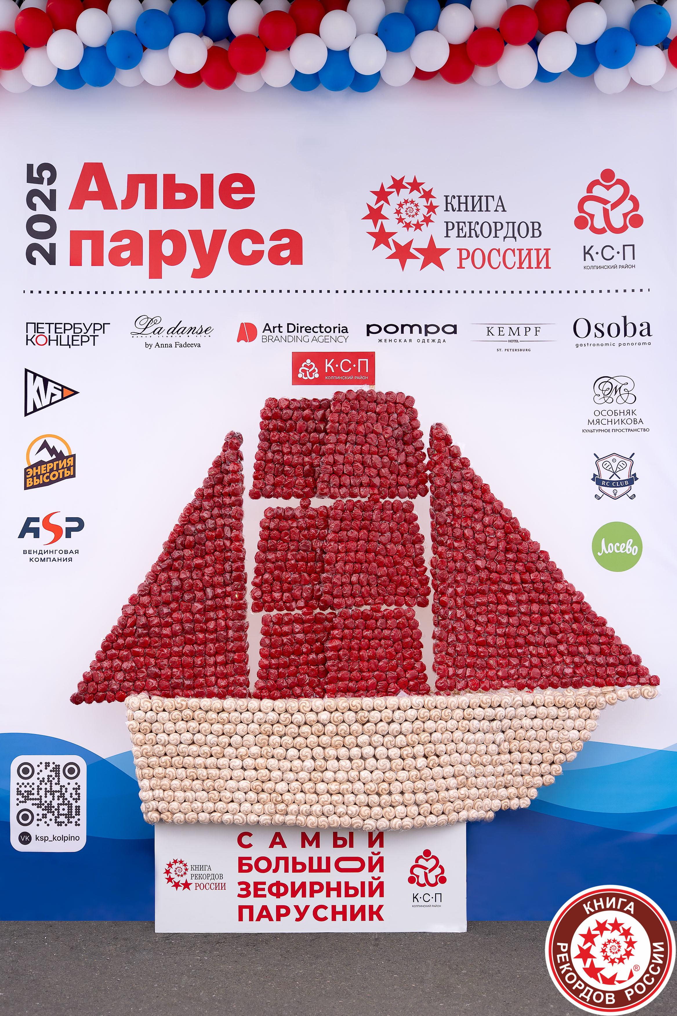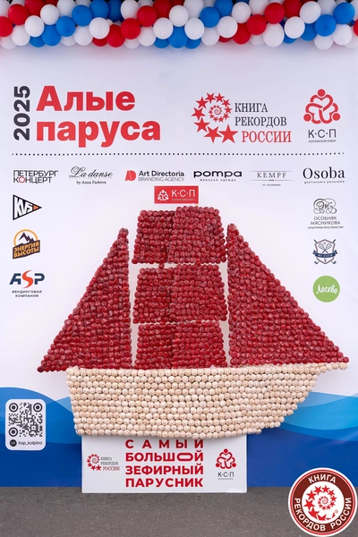 К празднику «Алые паруса» выпускникам из Петербурга подарили сладкий сюрприз — самый большой парусник из зефира. Кондитеры приготовили 115 килограммов воздушного лакомства, чтобы создать копию брига «Россия». Съедобный корабль с алыми парусами установили в фотозоне на Дворцовой площади.