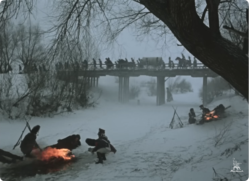 Здесь же массовка, изображавшая изможденную наполеоновскую армию, пересекала мост через речку Яхрому. Мост, попавший в кадр, не сохранился, на его месте возвели новый.