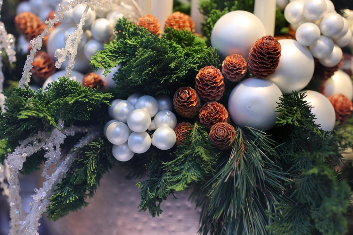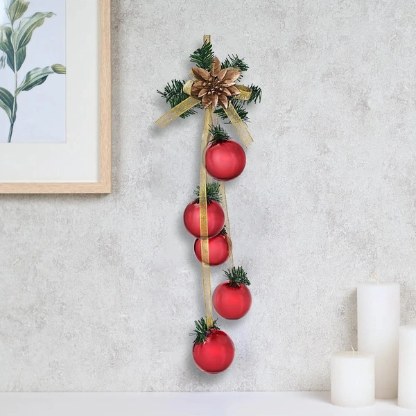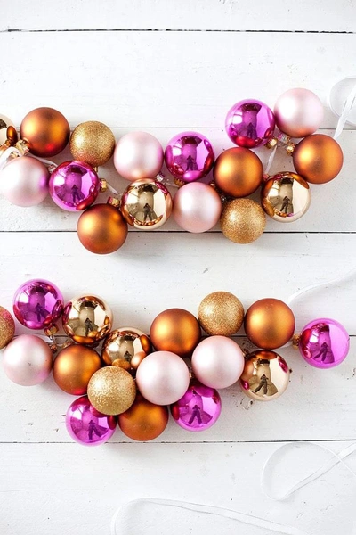 Для дополнительного декора подвесьте 5-7 небольших елочных шаров или гирлянду-бусы — получится композиция в духе классического рождественского декора, как в европейских домах.