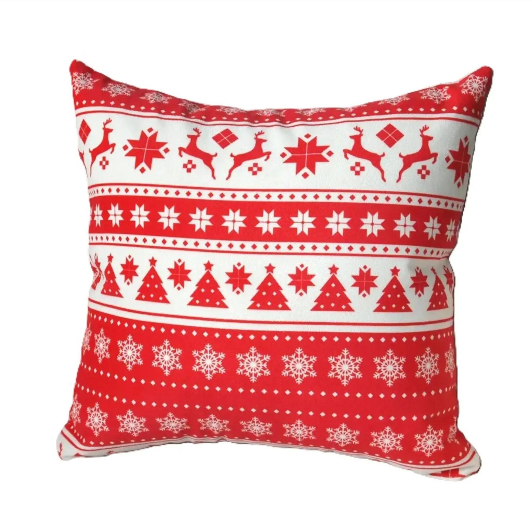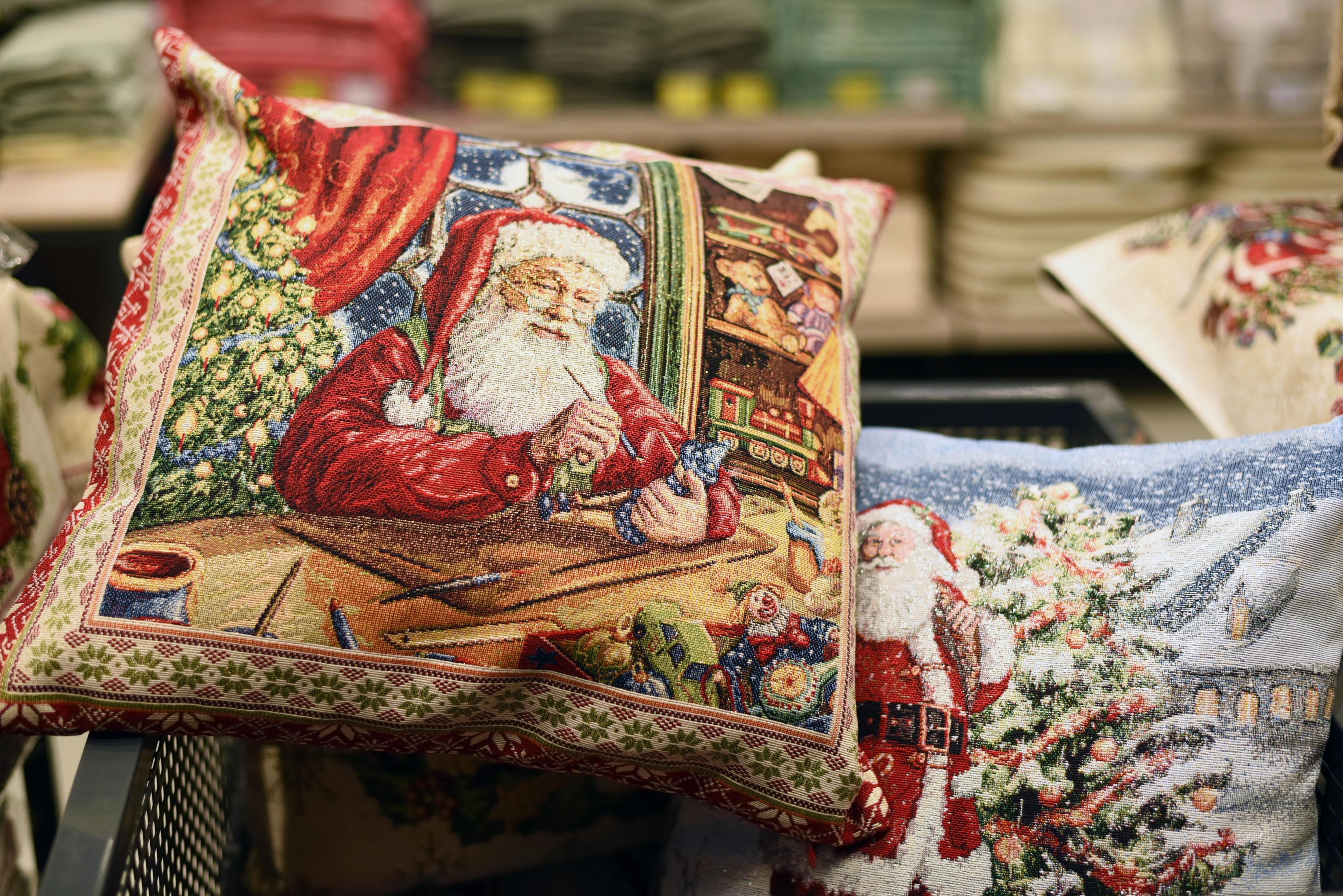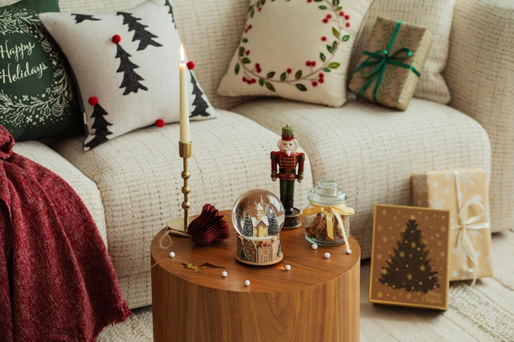 Текстиль с новогодними принтами — самый простой способ добавить праздничности. К примеру, декоративные подушки и наволочки могут быть с рождественскими рисунками, клетчатым принтом или с орнаментом в зимнем стиле. Достаточно разложить 3-5 подушек на диване или креслах, и комната преобразится.