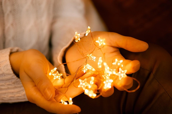 Гирлянда-нить подходит, чтобы украсить полку или раму зеркала. Обратите внимание на крупные лампочки — они дают мягкий уютный свет.