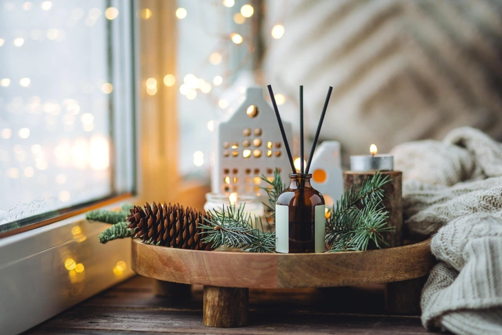 Усилить праздничную атмосферу можно с помощью ароматического диффузора. Это флакон с ароматной жидкостью, в которую погружают 3–5 палочек из пористой древесины. Жидкость пропитывает палочки и испаряется, за счет чего комната наполняется запахом. Традиционно «зимними» считаются композиции с цитрусовыми, ягодными и хвойными нотами, а также кардамоном, имбирем и корицей.