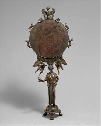 В эпоху Античности почти не существовало зеркал достаточно больших, чтобы отражать всю фигуру человека. Большинство из них оставались компактными и оснащались рукоятью, ушком для подвешивания или защитным металлическим чехлом, который позволял носить зеркало с собой — почти как косметические зеркала в наши дни. Большинство таких зеркал были украшены изображениями богов — главным образом, Афродиты, богини красоты и любви.