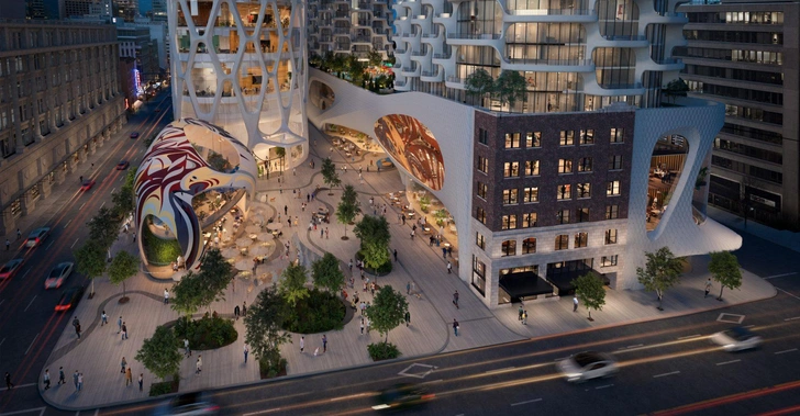 Башни комплекса планируется возвести на общем восьмиэтажном стилобате, в который для сохранения исторической застройки будет интегрирован фасад здания Randall Building 1926 года. Территория вокруг башен образует пешеходную площадь с кафе, ресторанами и магазинами, а отдельное внимание будет уделено культуре коренных народов: нижнюю часть фасада комплекса украсят росписи, отсылающие к визуальным мотивам аборигенов Канады.