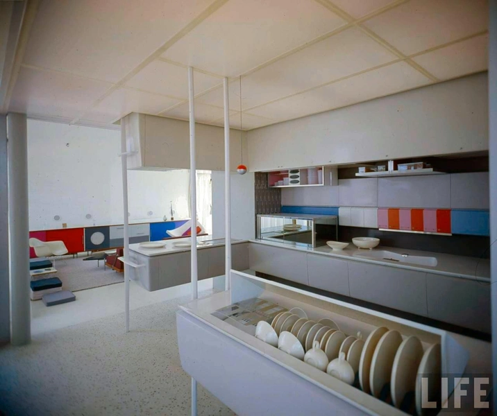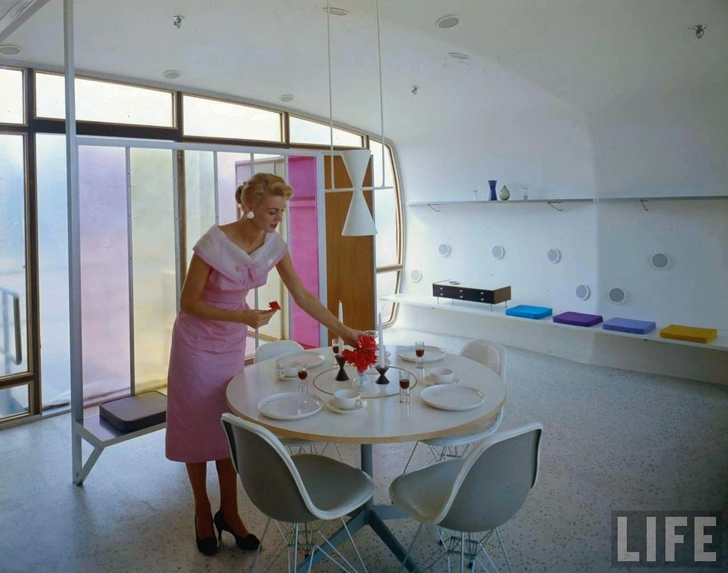 Кирпичей и бетона в составе дома не было — зато были акрилон, меламин, вискоза, виниловые полы, стеклопластик. Все это должно было показать, что пластик — материал будущего, способный заменить дерево, камень и металл.