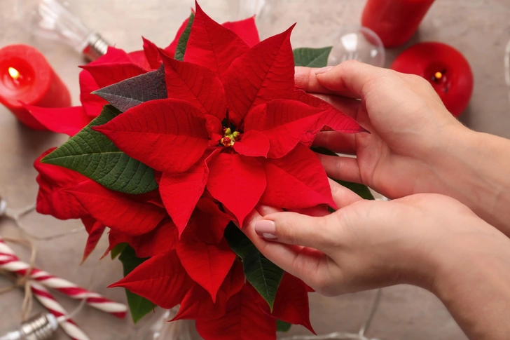 На время праздников поставьте пуансеттию повыше — на комод или стол, и ощущение праздника вам гарантировано.