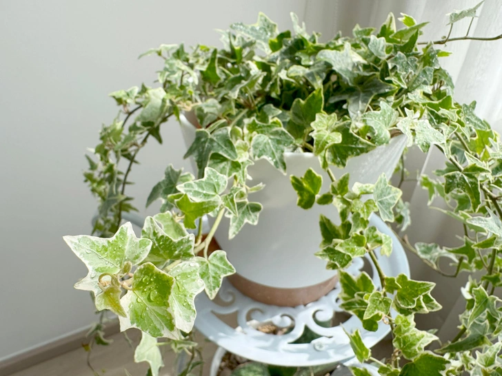 Благодаря длинным ниспадающим побегам плющ добавляет интерьеру объем и графичность. Он органично вписывается в зимние композиции на полках, консолях или в подвесных кашпо. В сочетании с миниатюрной иллюминацией плющ создает камерную атмосферу, но при этом не перегружает пространство.