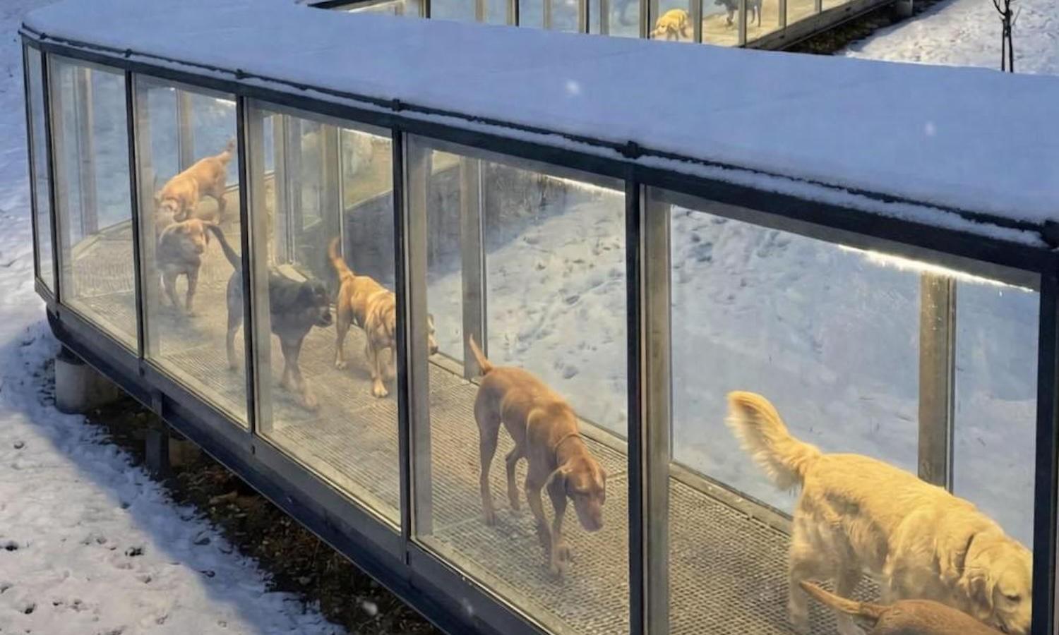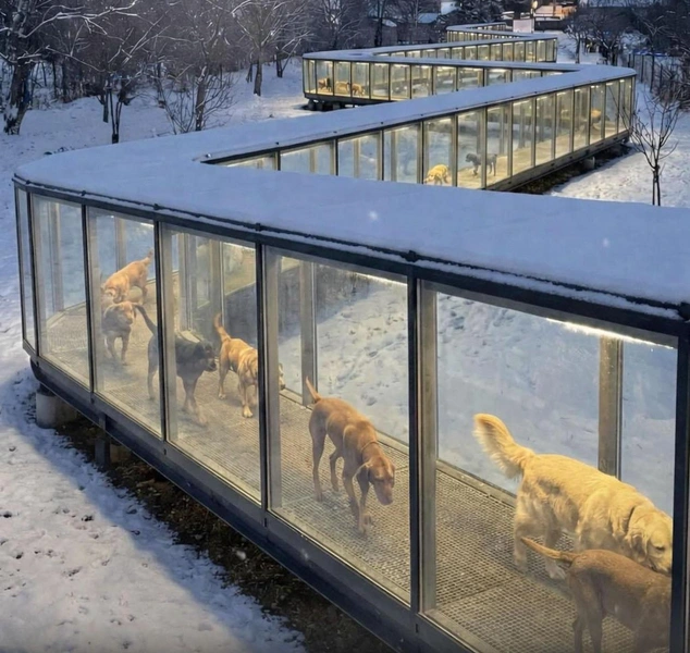 На первый взгляд, фотография кажется вполне правдоподобной. На ней изображено около дюжины собак, в зимних сумерках гуськом идущих по застекленному, хорошо освещенному коридору, зигзагообразно проходящему через заснеженный парк.