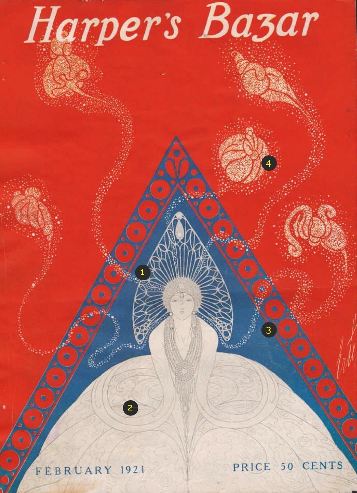 3. Треугольник. Одна из отличительных черт ар-деко — стремление обобщать формы вплоть до самых простых геометрических фигур. Вот и здесь Эрте вписывает героиню в треугольник, залитый чистым цветом и окаймленный орнаментом — еще одной страстью представителей стиля ар-деко.