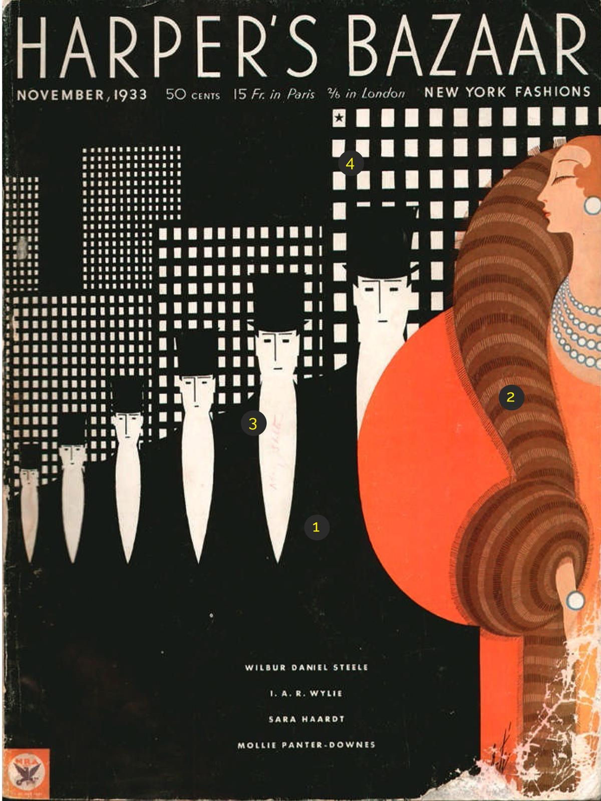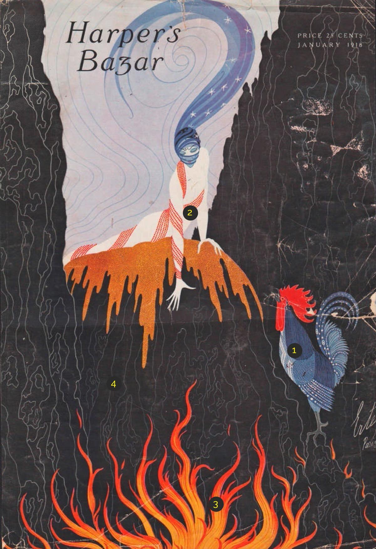 1. Контраст. Эрте максимально эффектно выделил героиню, «переключив цветовой режим» с черно-белого на цветной. При этом палитра у художника здесь заметно лаконичнее, чем в более ранних работах. Стиль развивается в сторону упрощения, и образы становятся более яркими и запоминающимися.