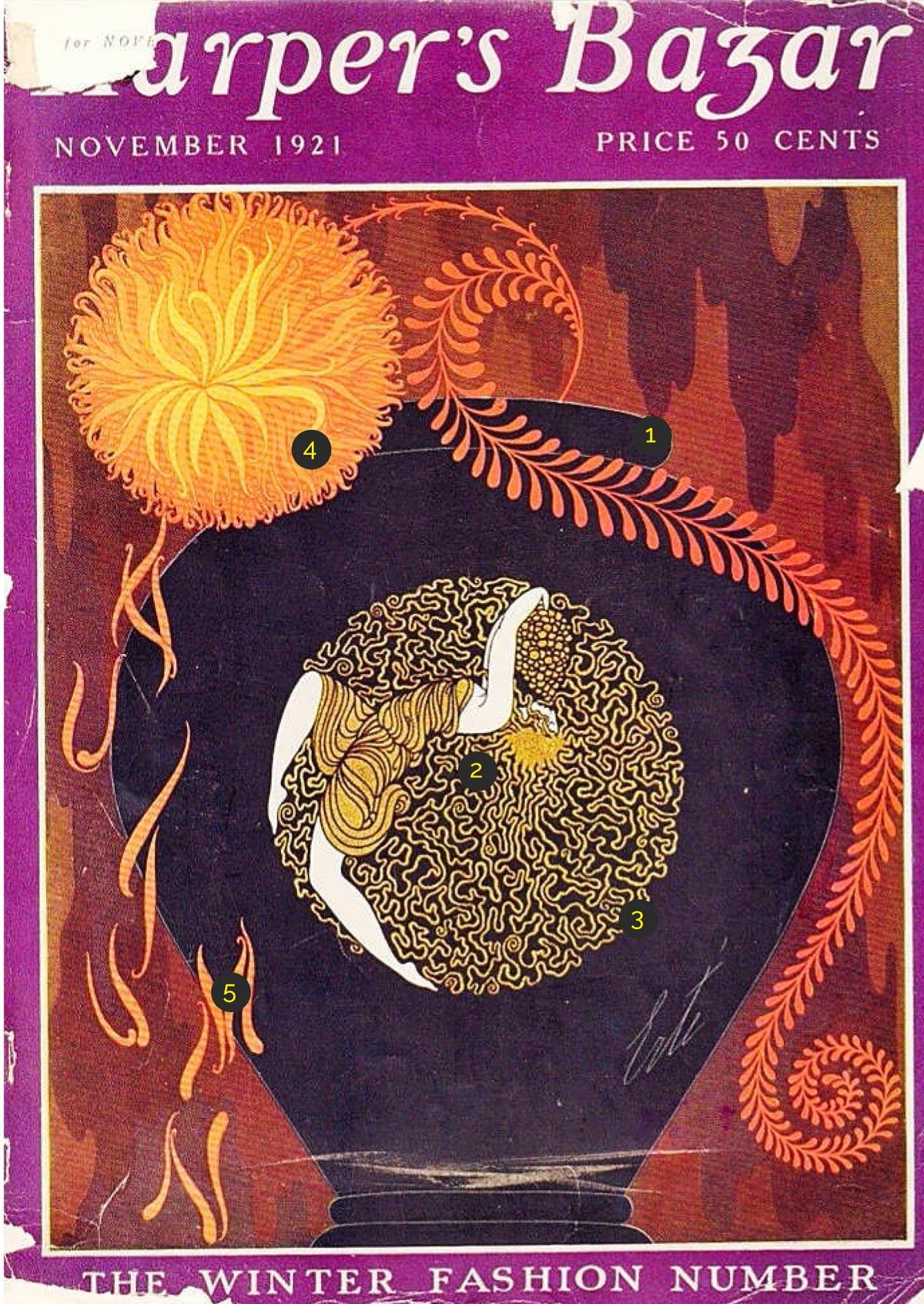 1. Сосуд. И сюжет, и цветовая гамма отсылают к древнегреческим краснофигурным вазам. Эрте в детстве много времени проводил в Эрмитаже; особенно его интересовала античная керамика, которую он тщательно зарисовывал. Несмотря на сюжет обложки, изображенный здесь сосуд не для вина — это ваза для увядающего осеннего цветка.