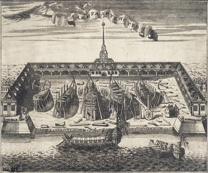 На материковой Адмиралтейской стороне было не менее людно. Центром кипения жизни было, конечно, Адмиралтейство — самое большое промышленное производство в столице. Поспешно возведенная в 1704 году Адмиралтейская верфь служила одновременно и крепостью, окруженной валами, — еще долго в Петербурге опасались, как бы шведы не сожгли эту колыбель русского флота.