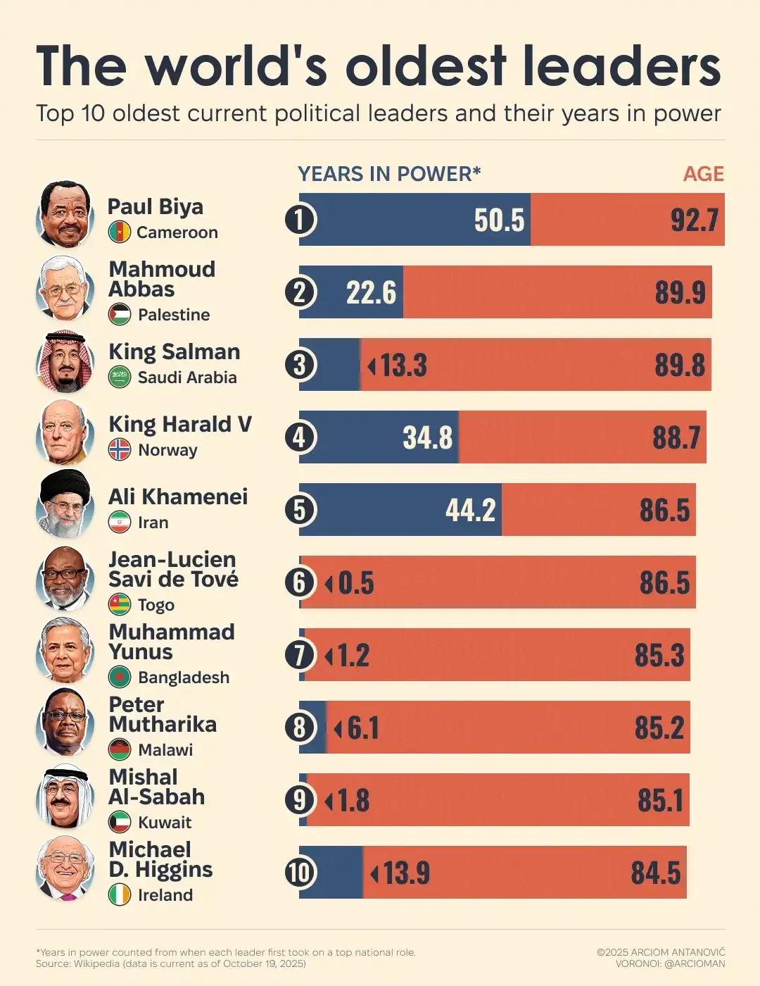 Ныне живущие мировые лидеры пока далеки от того, чтобы побить рекорд гроссмейстера, но и среди них хватает очень пожилых людей. Список из десяти самых старых президентов, королей и обладателей иных высших государственных должностей по состоянию на октябрь 2025 года оформил в виде инфографики пользователь портала Voronoi App под ником arcioman. На схеме указан как возраст каждого из них, так и срок пребывания у власти.