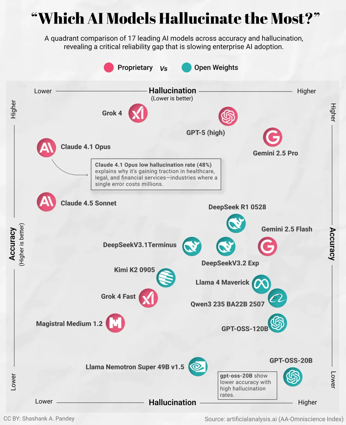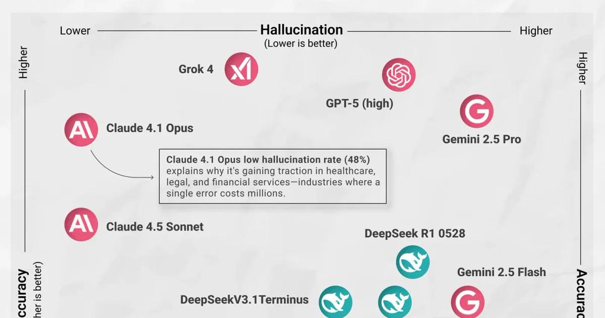 Как нетрудно заметить, в лидеры по показателю достоверности (вертикальная шкала) выбились модели GPT-5 (0,39), Grok 4 (0,39), Gemini 2.5 Pro (0,37), Claude 4.1 Opus (0,36), Claude 4.5 Sonnet (0,31). При этом по части «галлюцинирования» (горизонтальная шкала) лучше всех дела обстоят у двух последних моделей (по 0,48), тогда для Grok 4 этот показатель составляет 0,64, для GPT-5 — 0,81, а для Gemini 2.5 Pro — 0,89.