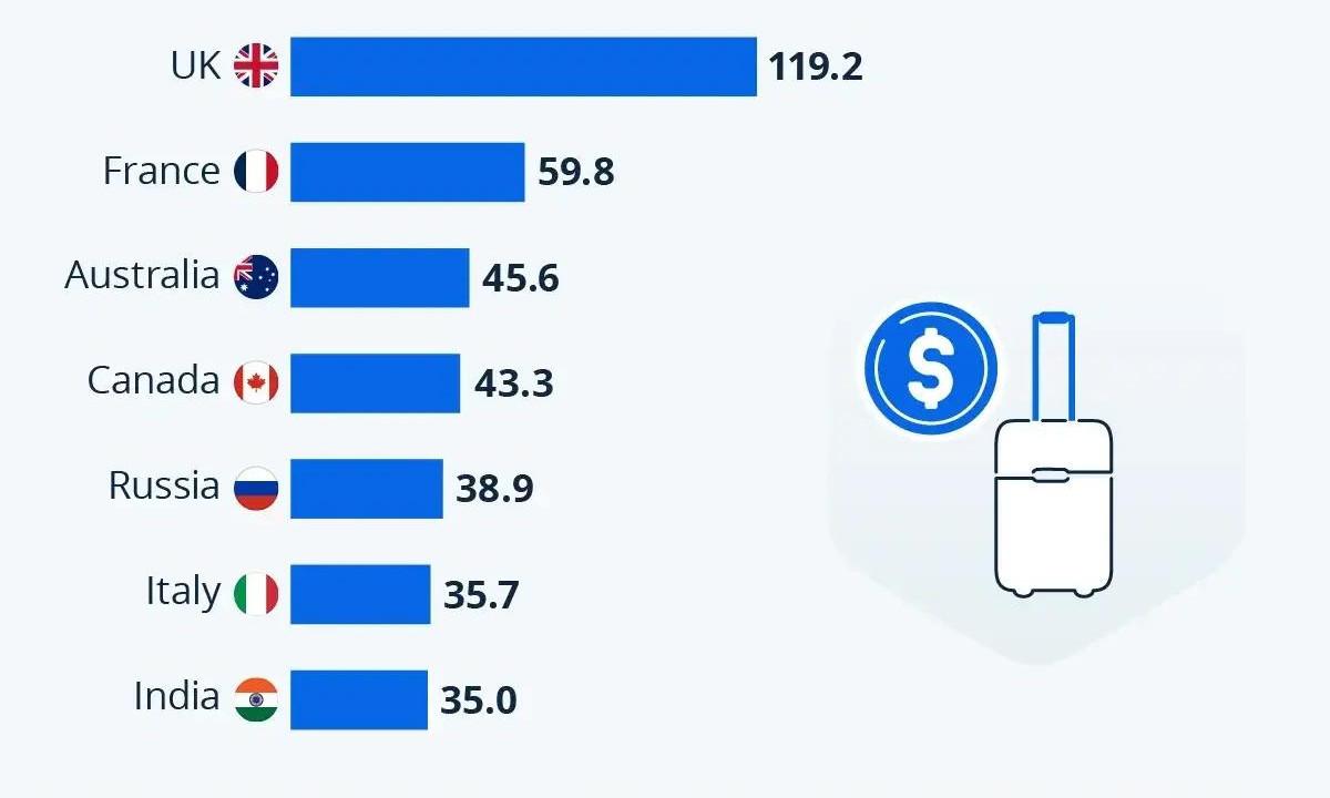 В десятку также попали Франция (59,8 млрд), Австралия (45,6 млрд), Канада (43,3 млрд), Россия (несмотря на визовые и прочие ограничения, граждане нашей страны потратили в путешествиях 38,9 млрд), Италия (35,7 млрд) и Индия (35 млрд).