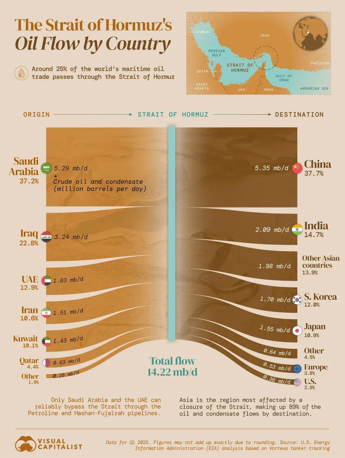 В деталях поставки нефти через перекрытый Ираном пролив разбирает вторая инфографика. Из нее следует, что в первом квартале 2025 года объем перевозок нефти по Ормузскому проливу составлял около 14,2 млн баррелей в сутки — около четверти всей морской торговли нефтью (чуть ниже, чем в более свежих данных первой инфографики). Более 37% этого объема составляла нефть из Саудовской Аравии, а далее в порядке убывания объемов следовали Ирак, ОАЭ, Иран, Кувейт и Катар.