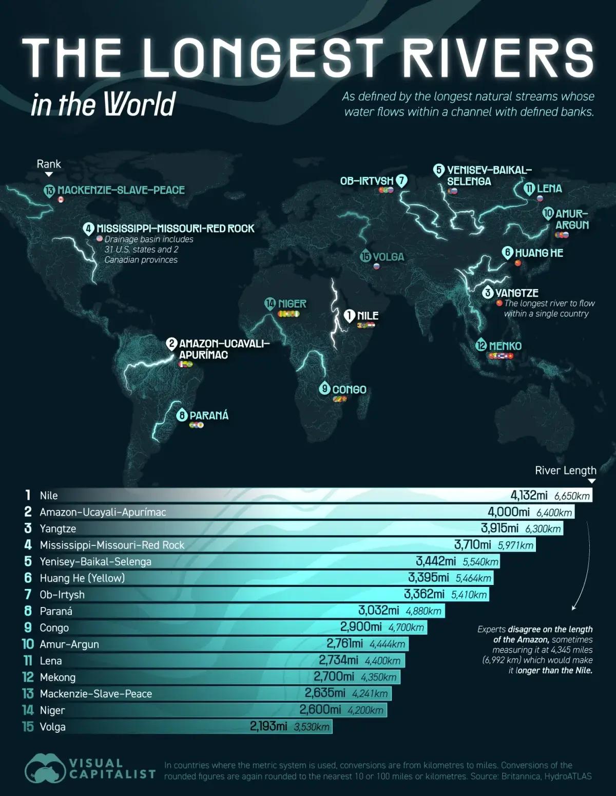 Именно такой топ-15 самых длинных речных систем и лег в основу свежей инфографики, подготовленной порталом Visual Capitalist. В нем первое место занимает Нил (6 650 километров), а второе — Амазонка (6 400 километров), хотя некоторые исследователи считают самой длинной рекой именно Амазонку.
