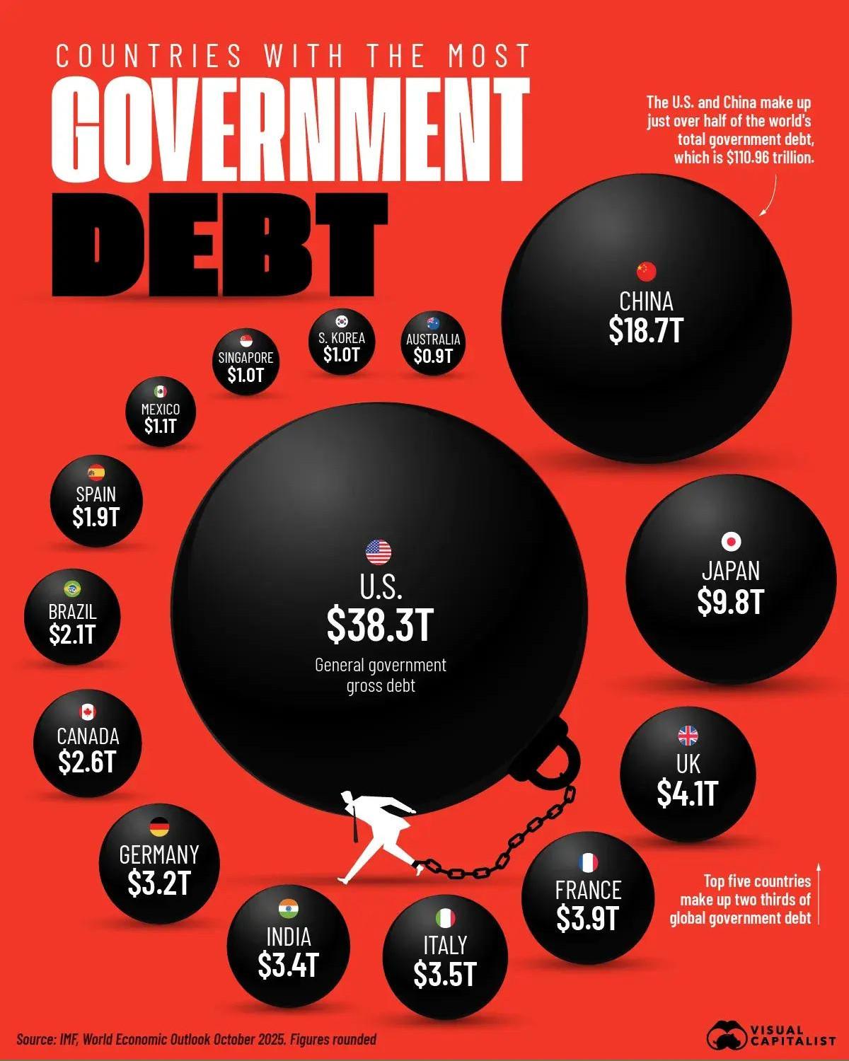 Здесь на помощь приходит свежая инфографика, подготовленная порталом Visual Capitalist. На основе данных Международного валютного фонда (МВФ) за октябрь 2025 года участники проекта визуализировали топ-15 стран по объему государственного долга.