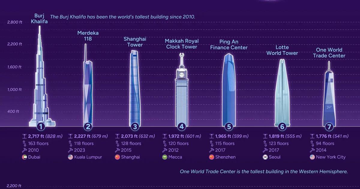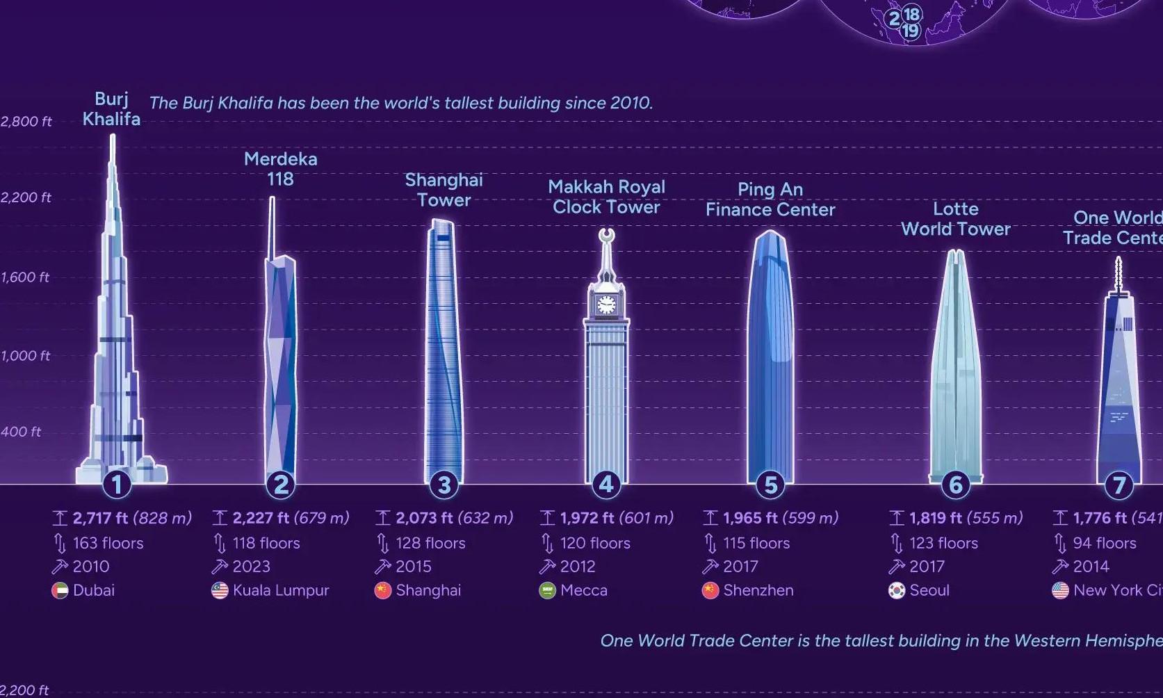 Абсолютным лидером этого рейтинга уже более 15 лет остается 828-метровый небоскреб Бурдж-Халифа в Дубае, опережающий башню Мердека 118 в Куала-Лумпуре почти на 150 метров. Замыкает тройку 632-метровая Шанхайская башня, достроенная в 2015 году.