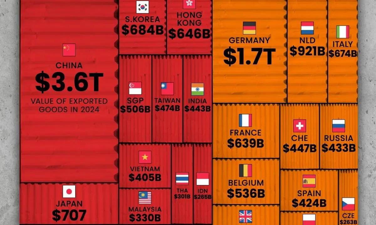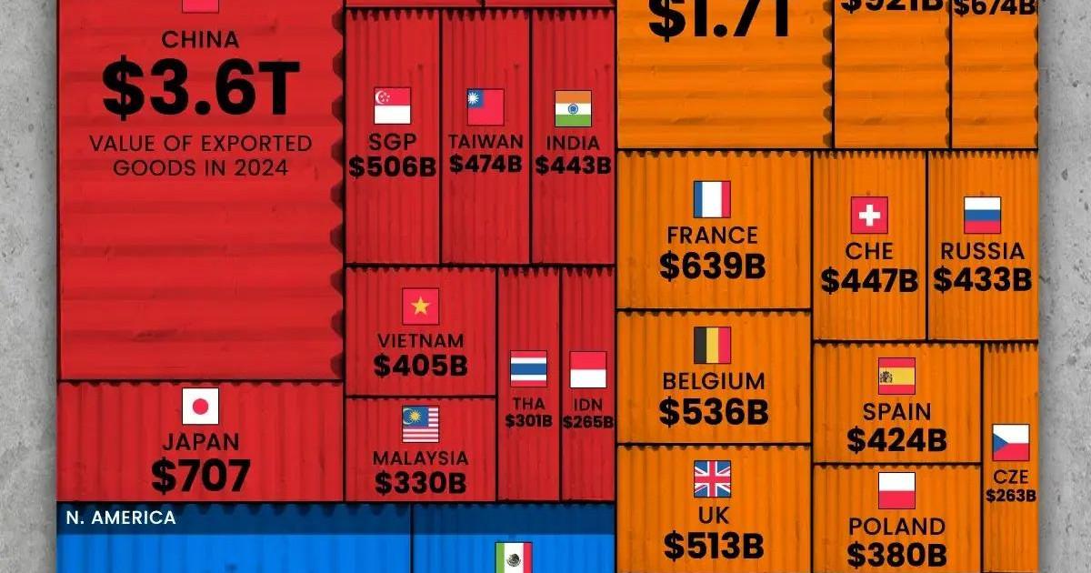 На инфографике выше, подготовленной порталом Visual Capitalist на основе данных Всемирной торговой организации (ВТО), в виде морских контейнеров разного размера перечислены страны, занявшие первые 30 мест в рейтинге государств по объему экспорта различных товаров в 2024 году. Цветом на схеме выделены различные регионы. Красным — страны Азии, оранжевым — Европы, синим — Северной Америки, зеленым — Ближнего Востока, голубым — Океании, а желтым — Южной Америки. Страны Африки в список не попали.