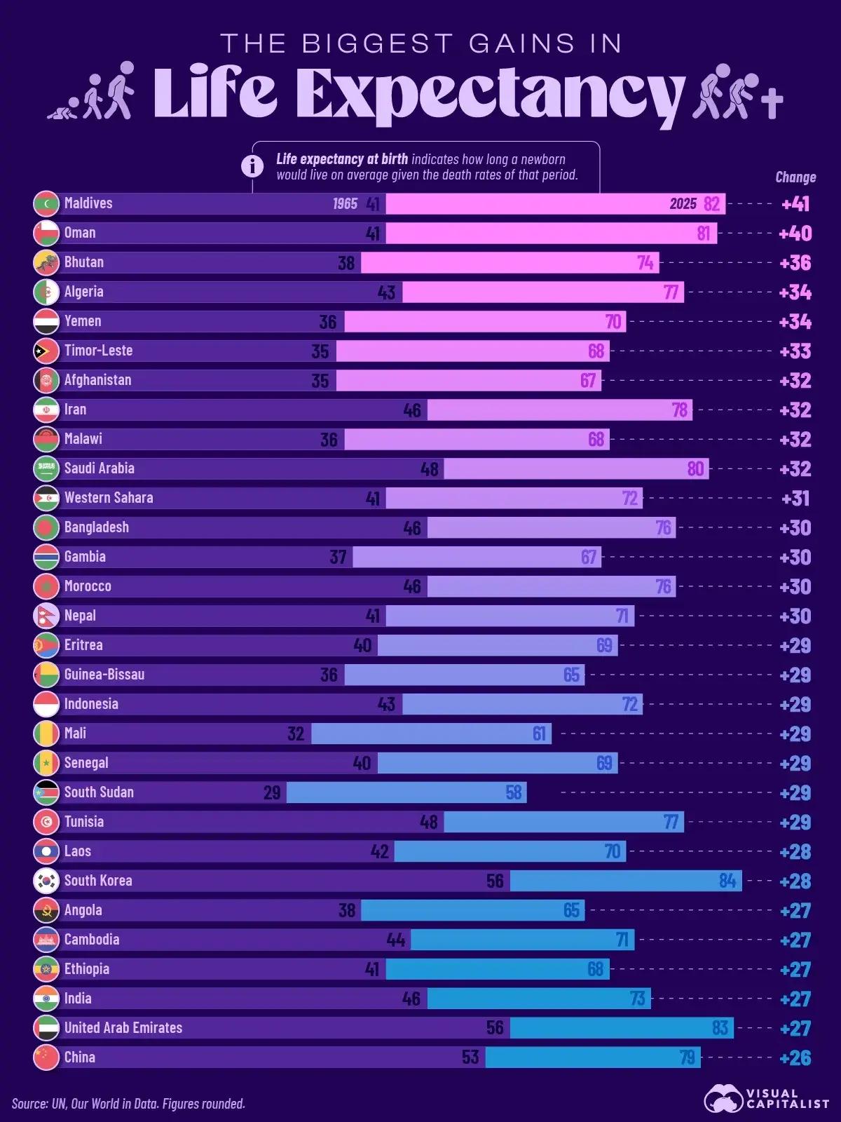 Подтверждением тому служит представленная ниже инфографика от портала Visual Capitalist, на которой представлен топ-30 стран по приросту ОПЖ с 1965-го по 2025 год. Согласно данным ООН и проекта Our World in Data, лидером по этому показателю стали Мальдивы: за 60 лет ОПЖ жителей островного государства выросла ровно вдвое, с 41 года до 82 лет. Далее идут Оман (с 41 до 81 года), Бутан (с 38 до 74 лет), Алжир (с 43 до 77 лет) и Йемен (с 36 до 70 лет).
