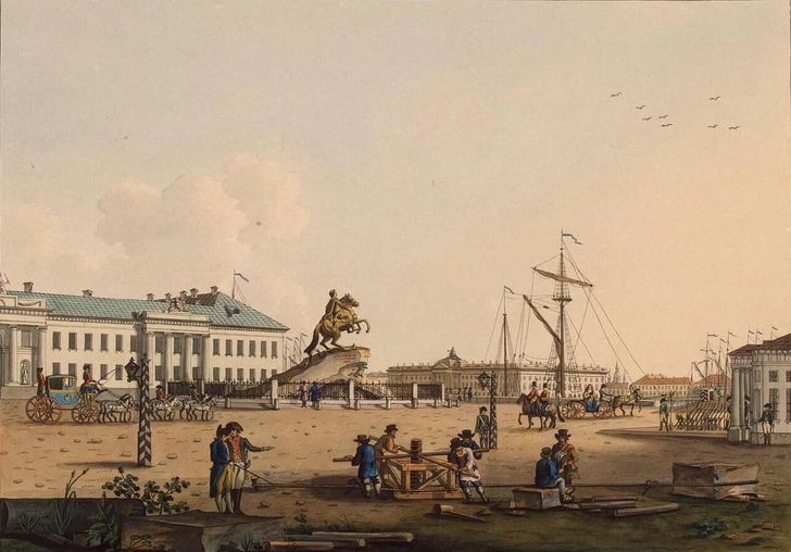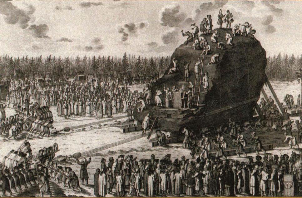 … Фальконе с сыном и невесткой из мастерской пошли к Неве, где возвышался знаменитый Гром-камень — доставленная еще в 1770 году из Лахты огромная гранитная скала — пьедестал, на котором предполагалось поставить конную статую Петра.