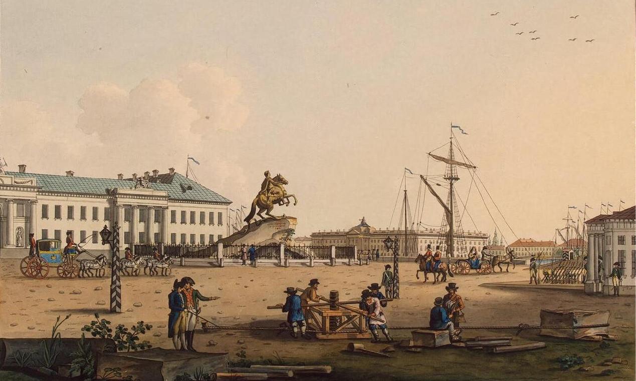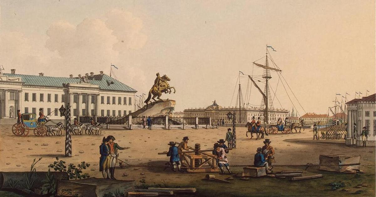 Ранним утром 10 сентября 1777 года Этьен Морис Фальконе проснулся от истошных криков прислуги и ржания коней во дворе. «Пожар!» — подумал он и стал поспешно одеваться, но, взглянув в окно, замер от неожиданности. Напротив его дома, стоящего на Морской улице, вместо привычного, надоевшего пейзажа — низеньких домиков и болотистого Адмиралтейского луга за ними — расстилалось огромное водное пространство, покрытое волнами, А на дом, закрывая свет в окне, надвигался огромный корабль…
