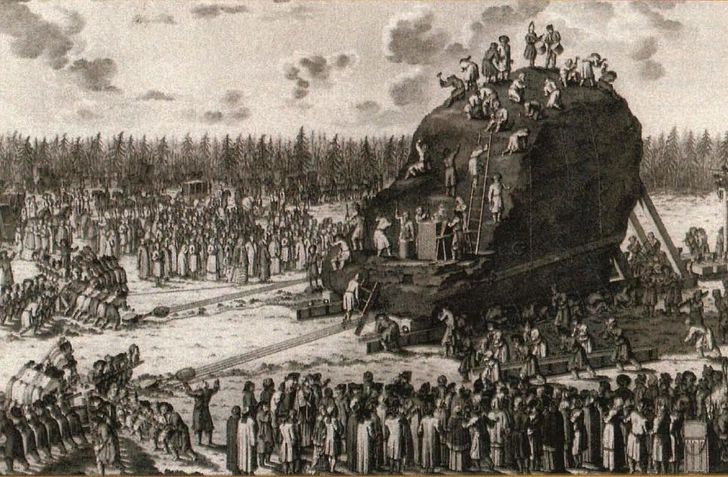 Фальконе рассказал сыну, как изобретательно доставили из Карелии эту махину и как ювелирно точно ее сгрузили на берег. Для народа, столпившегося вокруг, это было грандиозное, фантастическое зрелище — каменная гора «сама» сползла с судна и «покатилась» к указанному месту по желобам на десятках медных шаров.