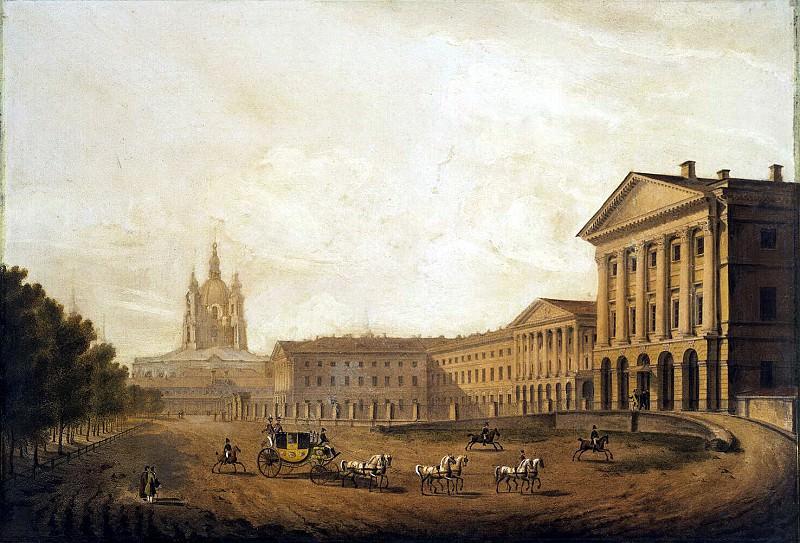 Затем, примерно с 80-х годов XVIII века, на место возвышенной и несколько суровой архитектуры французской школы пришли ясные, изящные формы, уходящие корнями к гению итальянской архитектуры XVI века Андреа Палладио. В Петербурге стали популярны многочисленные постройки Джакомо Кваренги — здание Академии наук, Эрмитажный театр, Александровский дворец в Царском Селе. Позже Кваренги построил Конногвардейский манеж и Смольный институт.