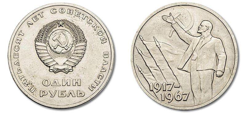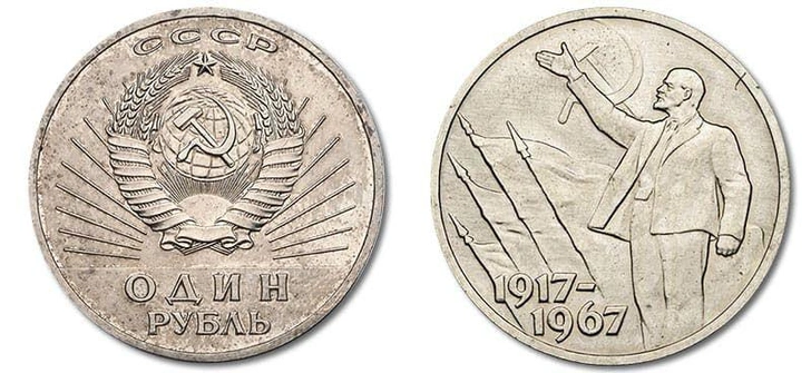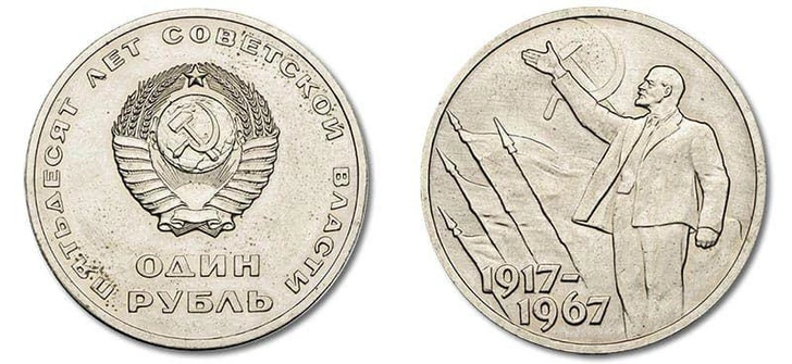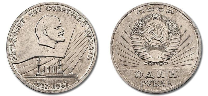 Сразу три строчки в рейтинге самых дорогих монет Советского Союза занимают пробные экземпляры юбилейного рубля, отчеканенные в 1967 году к 50-летнему юбилею революции.