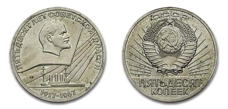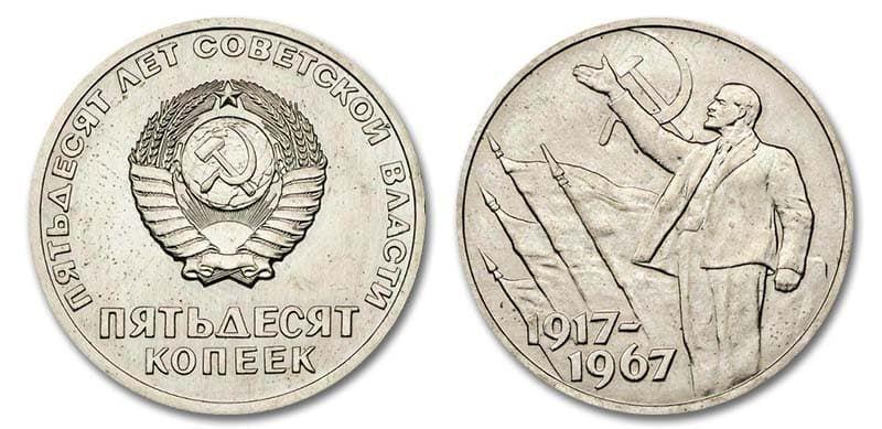 К юбилею Октябрьской революции в СССР в 1967 году были на пробу отчеканены не только рублевые монеты. Раритетом являются и пробные монеты номиналом 50 копеек. Известные две разновидности этих монет. Более дорогим является вариант с малым гербом СССР на аверсе и фигурой Ленина на реверсе — в 2016 году такую монету продали на аукционе за 3,55 миллиона рублей.