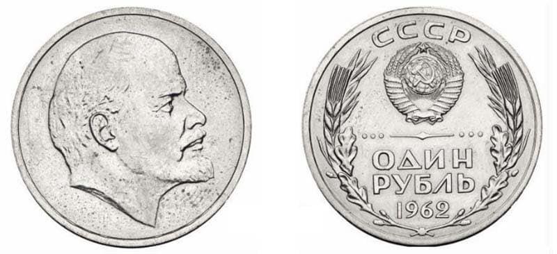 Уникальная пробная монета номиналом 1 рубль с обращенным вправо профилем Ленина на реверсе и гуртовой надписью «Союз Советских Социалистических Республик» также известна только в одном экземпляре. Отчеканенную в 1962 году и прекрасно сохранившуюся монету в 2016 году продали на аукционе за 8,8 миллиона рублей.