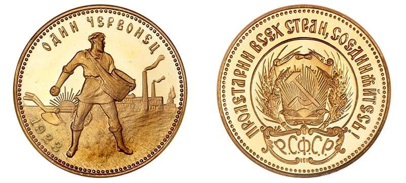В 1923 году в СССР начали чеканить золотые червонцы, которые прозвали «сеятелями». Чтобы понять, почему появилось такое название, достаточно взглянуть на реверс монеты, где изображен крестьянин-сеятель на фоне плуга и восходящего солнца. На аверсе монеты был изображен герб РСФСР с надписью «Пролетарии всех стран соединяйтесь».