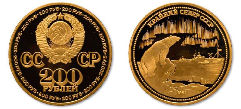 В начале 1980-х годов в СССР планировали выпустить ряд памятных монет из серебра, золота и платины. В их числе была и золотая монета «Крайний Север СССР» номиналом 200 рублей в полированной версии. В итоге в 1981 году было отчеканено всего несколько экземпляров монеты с белым медведем и северным сиянием на реверсе. Один из них в 2017 году был продан на торгах за 5,5 миллиона рублей.