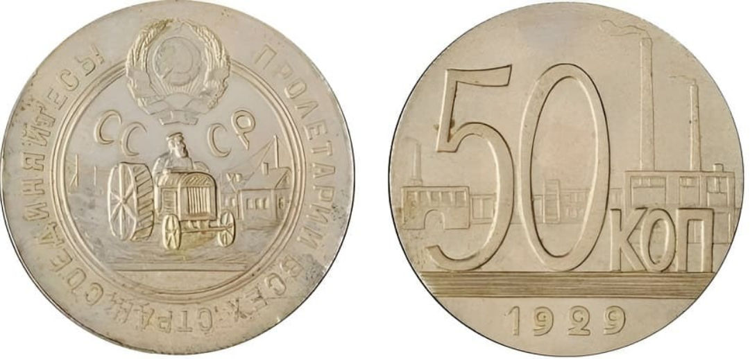 Пробные образцы любых денежных знаков стоят очень дорого, так как существуют в нескольких или даже единственном экземпляре. К таким нумизматическим редкостям относится пробная монета 1929 года номиналом 50 копеек. Ее дизайн разрабатывался на Ленинградском монетном дворе: на аверсе вместо крупного герба СССР поместили изображение крестьянина за рулем трактора, а на реверсе были изображены фабричные здания.