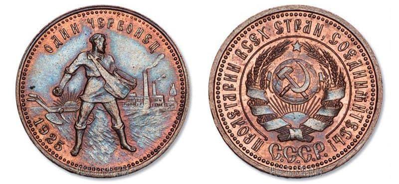 В 1925 году в СССР решили обновить дизайн прежних золотых червонцев-«сеятелей». Реверс с крестьянином оставался прежним, а вот на аверсе герб РСФСР предполагалось изменить на герб СССР. В итоге были отчеканены пробные экземпляры монеты из меди и из золота, но в серию она не пошла. Единственный известный медный вариант этого червонца в 2008 году продали за 5 миллионов рублей.