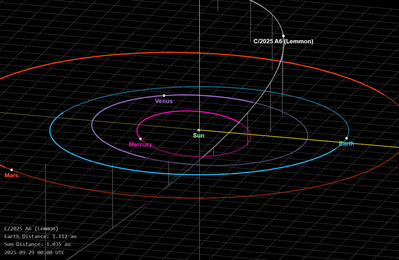 В октябре она пройдёт на расстоянии менее 100 миллионов километров от Земли, по космическим меркам это не слишком много, но землянам не стоит опасаться — столкновение нашей планеты и C/2025 A6 (Lemmon) исключено.
