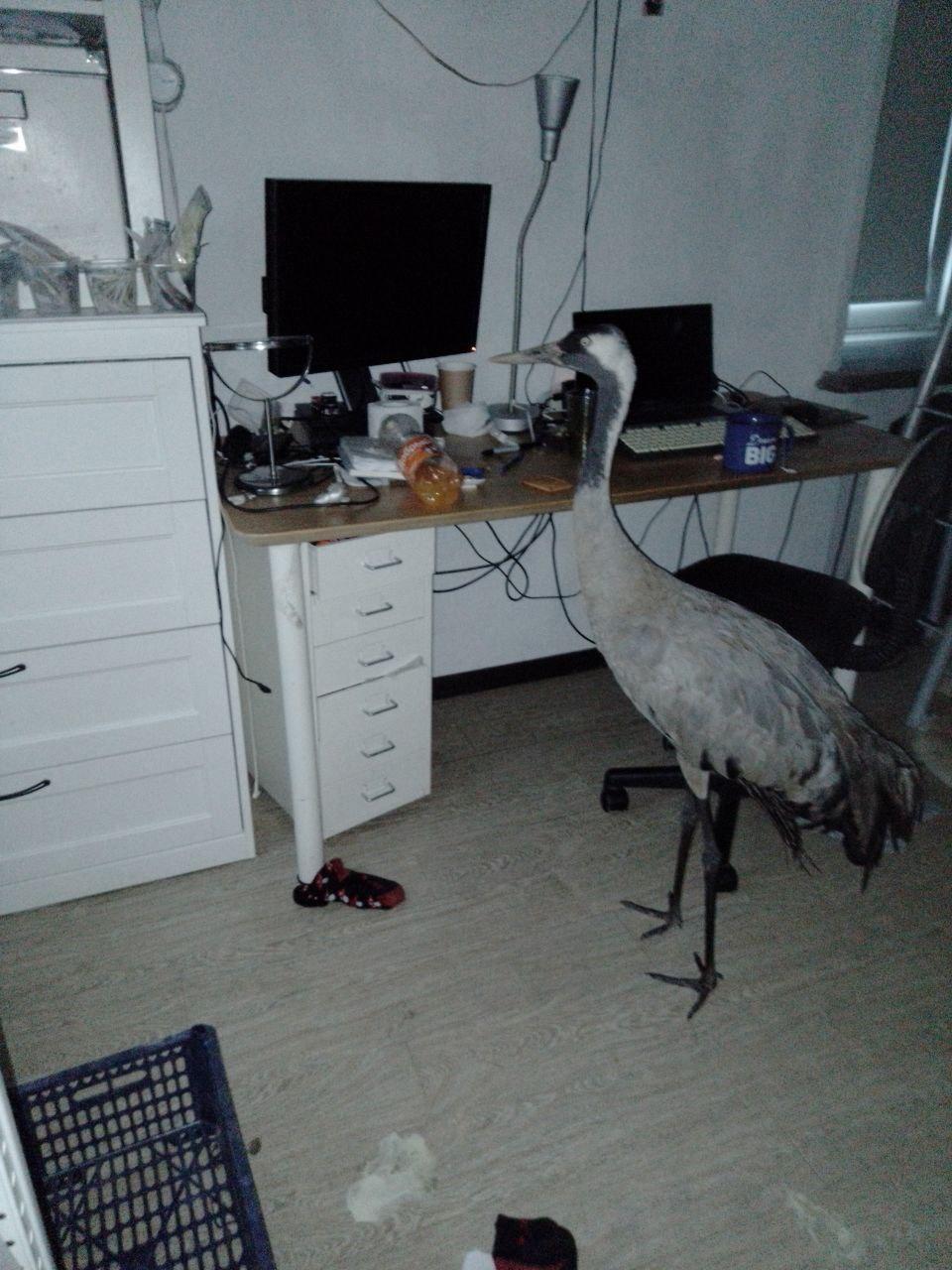Журавля, который уже смирился со своей судьбой, заперли в спальне. После того как он все пометил и навел шороху в квартире, решили, что он переночует в подвале частного дома у родителей Олега. Наутро журавль уехал с волонтером в Барнаул.